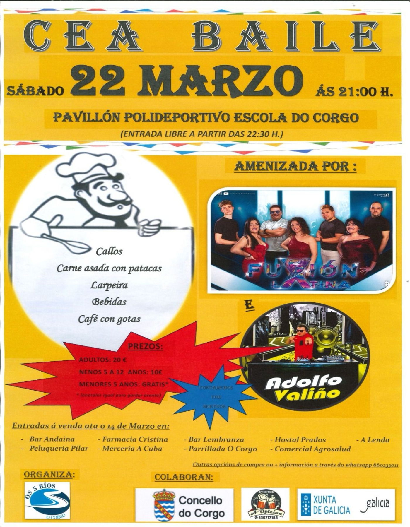 Nuestros compañeros de Os Cinco Ríos organizan una gran Cea-Baile el 22 de marzo en O Corgo, con cena, música en vivo y sorteos. ¡No os lo perdáis!