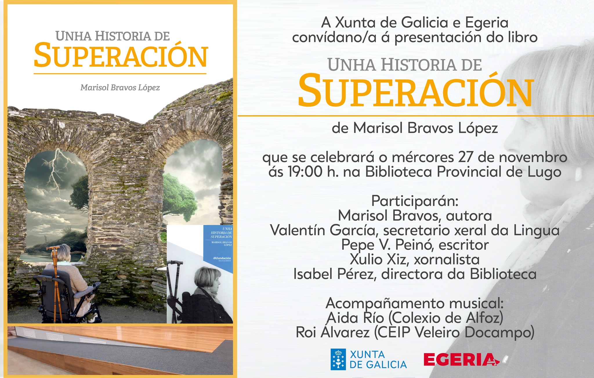 A Xunta de Galicia e Egeria organizan a presentación do libro “Unha historia de superación”, escrito por Marisol Bravos López, activista destacada na loita polos dereitos das persoas con diversidade funcional e colaboradora habitual da nosa asociación. O acto terá lugar o mércores 27 de novembro ás 19:00 h na Biblioteca Provincial de Lugo.